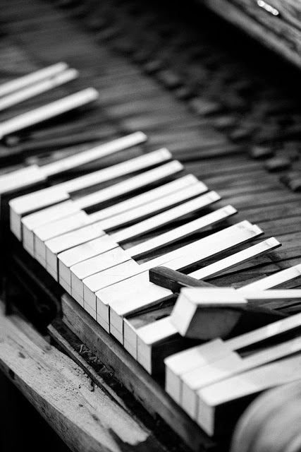 Do broken pianos play broken songs? Do they have busted melodies for busted hearts? Is there a song living inside it that's waiting to get out? Her keys are shattered and her notes long since silent but I can still hear her song. Just listen, just listen.